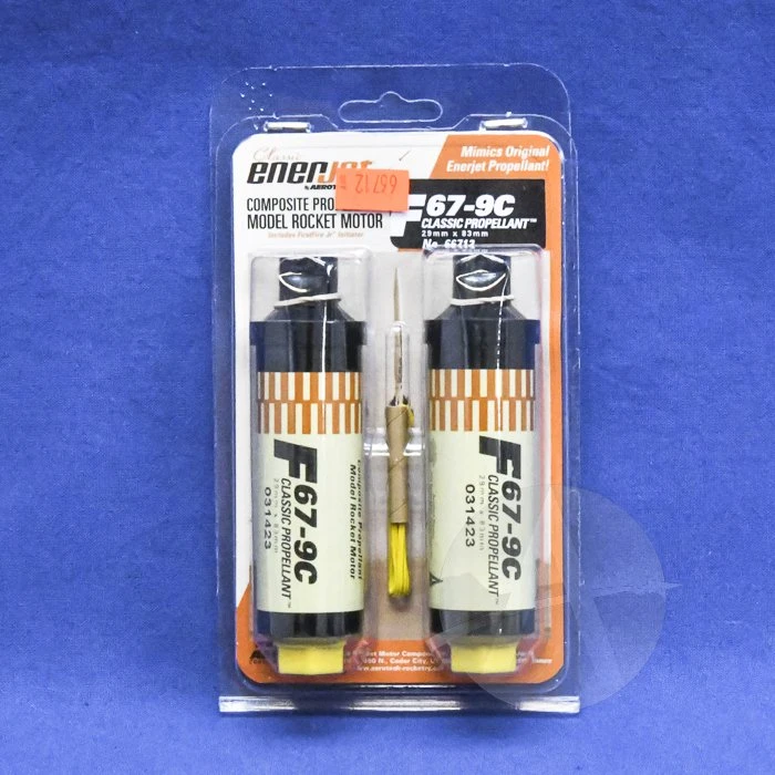 The F67C rocket motor is a true “Blast From the Past” as it mimics the look, sound and performance of the original Enerjet Propellant. The motor has a translucent exhaust plume studded with supersonic shock diamonds and no smoke, which appears to make your rocket leap off the launch pad.