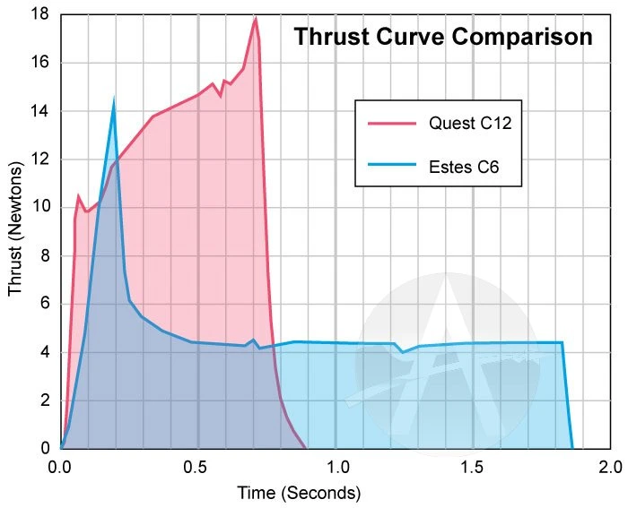 The Quest C12-6 is a great all-around motor for your typical rockets. It is particularly suited for heavier or larger diameter rockets. It features composite propellant, which has twice the energy as a black powder motor. Same size and diameter as an Estes motor, so it fits all your favorite rockets. But this is for single-stage rockets only, as it cannot be staged.
